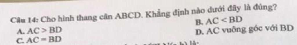 `B. AC<BD->` Sai vì `2` đường chéo của hình thang cân bằng nhau
