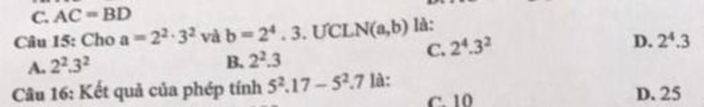 $15)\\ a=2^2.3^2\\ b=2^4.3\\ ƯCLN(a,b)=2^2.3=12.$
