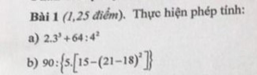 $a) 2.3^3+64:4^2\\ =2.27+4^3:4^2\\ =54+4\\ =58\\ b) 90:\{5.[15-(21-18)^2]\}\\ =90:\{5.[15-3^2]\}\\ =90:\{5.[15-9]\}\\ =90:\{5.6\}\\ =90:30\\ =3.$