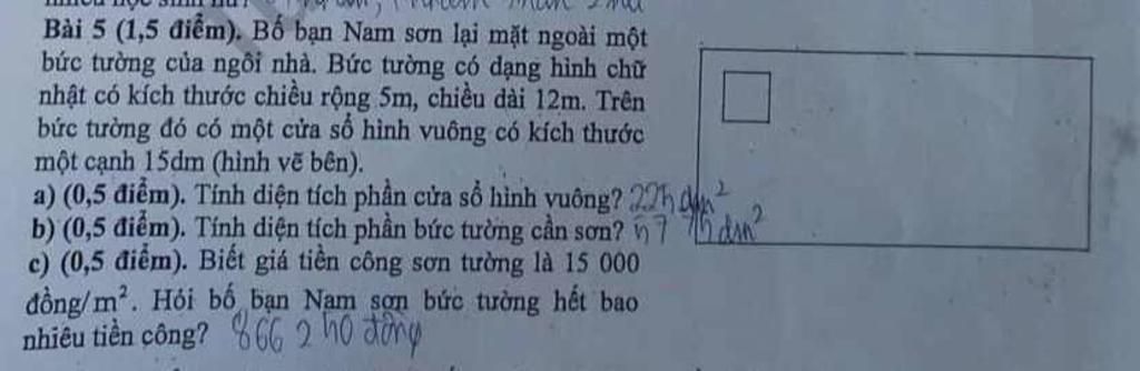 Đáp số `:a)2,25m^2;b)57,75m^2;c)866250` đồng