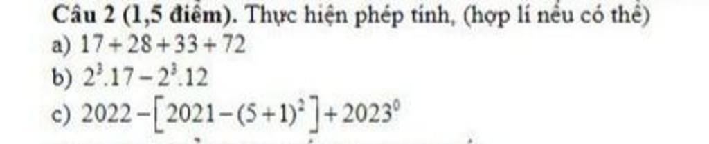 $a) 17+28+33+72\\ =( 17+33)+(28+72)\\ =50+100\\ =150\\ b) 2^3.17-2^3.12\\ =2^3(17-12)\\ =2^3.5\\ =8.5\\ =40\\ c) 2022-[2021-(5+1)^2]+2023^0\\ =2022-[2021-6^2]+1\\ =2022-[2021-36]+1\\ =2022-1985+1\\ =37+1\\ =38.$