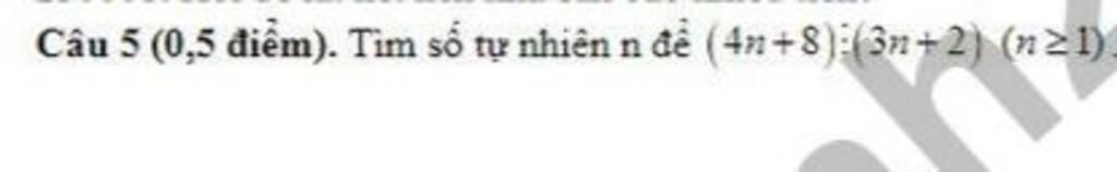 $(4n+8) \ \vdots \ (3n+2) (n \ge 1)\\ \Rightarrow 3(4n+8) \ \vdots \ (3n+2)\\ \Rightarrow (12n+24) \ \vdots \ (3n+2)\\ \Rightarrow [(12n+8)+16] \ \vdots \ (3n+2)\\ \Rightarrow [4(3n+2)+16] \ \vdots \ (3n+2)\\ \Rightarrow 16 \ \vdots \ (3n+2) \text{ do } 4(3n+2)\ \vdots \ (3n+2)\\ \Rightarrow (3n+2) \in Ư(16)\\ \Rightarrow (3n+2) \in \{1;2;4;8;16\}\\ \Rightarrow 3n \in \{-1;0;2;6;14\}\\ \Rightarrow n \in \left\{-\dfrac{1}{3};0;\dfrac{2}{3};2;\dfrac{14}{3}\right\}$
