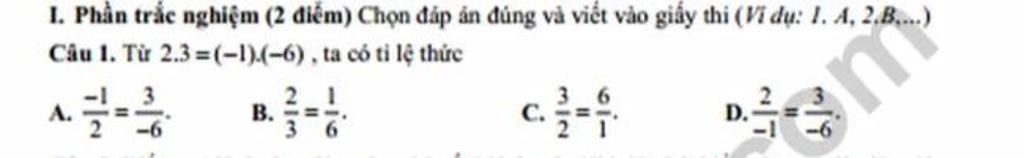 `=>` Áp dụng công thức thì tỉ lệ thức của `2.3=(-1)(-6)` là: `(-1)/2=3/-6```
