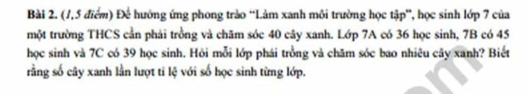 Gọi số cây xanh phải trông và chăm sóc của ba lớp $7A, 7B,7C$ lần lượt là $x,y,z (x,y,z \in \mathbb{N^*}$, cây)