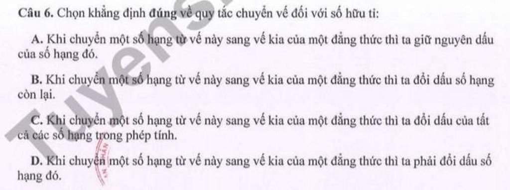 Quy tắc chuyển vế, khi chuyển một số hạng từ vế này sang vế kia phải đối dấu của số hàng đó `=>` D đúng