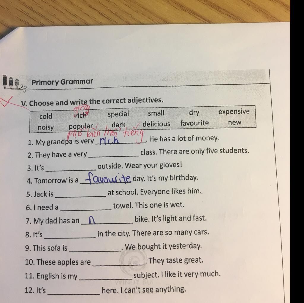 Câu 7 : expensive (đắt) vì trước nó là "an",chỉ có expensive là tính từ bắt đầu bằng nguyên âm