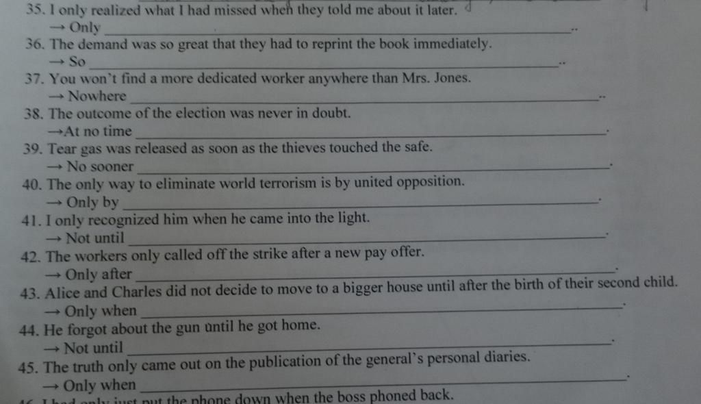 Vâng ạ, mà `40` có `2` cách á, `-` Only by uniting opposition can world terrorism be climinated .