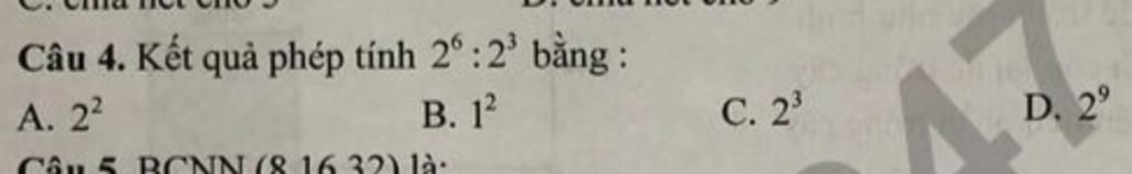Ta có \(a^{m}:a^{n}=a^{m-n}\Rightarrow 2^{6}:2^{3}=2^{6-3}=2^{3}\)