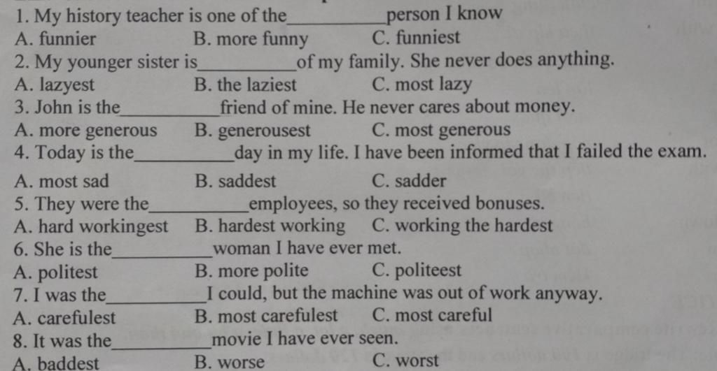 `-` Funny (adj): hài hước : Tính từ tận cùng `=` /y/ `->` chuyển thành /i/+Est