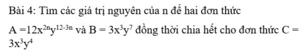 Lại có: `12x^(2n) y^(12 -3n) : 3x^3 y^4`