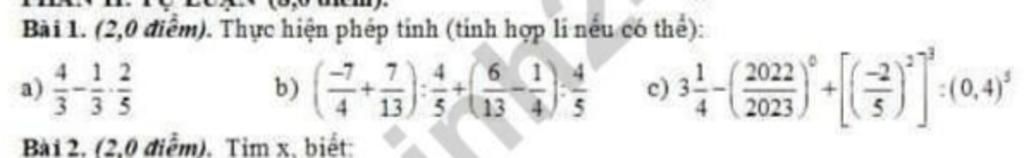 $a) \dfrac{4}{3}-\dfrac{1}{3}.\dfrac{2}{5}\\ =\dfrac{4}{3}-\dfrac{2}{15}\\ =\dfrac{20}{15}-\dfrac{2}{15}\\ =\dfrac{18}{15}\\ =\dfrac{6}{5}\\ b) \left(\dfrac{-7}{4}+\dfrac{7}{13}\right):\dfrac{4}{5}+\left(\dfrac{6}{13}-\dfrac{1}{4}\right):\dfrac{4}{5}\\ =\left(\dfrac{-7}{4}+\dfrac{7}{13}+\dfrac{6}{13}-\dfrac{1}{4}\right):\dfrac{4}{5}\\ =\left(\dfrac{-7}{4}-\dfrac{1}{4}+\dfrac{7}{13}+\dfrac{6}{13}\right):\dfrac{4}{5}\\ =\left(\dfrac{-8}{4}+\dfrac{13}{13}\right):\dfrac{4}{5}\\ =(-2+1).\dfrac{5}{4}\\ =-\dfrac{5}{4}\\ c)3\dfrac{1}{4}-\left(\dfrac{2022}{2023}\right)^0+\left[\left(\dfrac{-2}{5}\right)^2\right]^3:(0,4)^5\\ =\dfrac{13}{4}-1+\left(\dfrac{-2}{5}\right)^{2.3}:(0,4)^5\\ =\dfrac{9}{4}+\left(-0,4\right)^6:(0,4)^5\\ =\dfrac{9}{4}+\left(0,4\right)^6:(0,4)^5\\ =\dfrac{9}{4}+0,4\\ =\dfrac{9}{4}+\dfrac{2}{5}\\ =\dfrac{45}{20}+\dfrac{8}{20}\\ =\dfrac{53}{20}.$