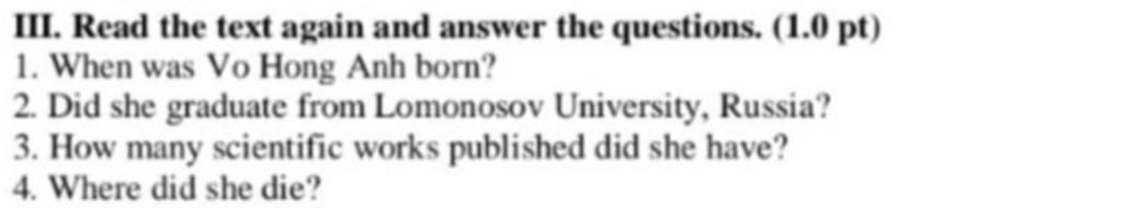 ( Dấu hiệu nhận biết câu b : She graduated from Lomonosov University, Russia, in 1965). On returning to Viet Nam, she worked as a researcher at the National Institute of Science. In 1982 she successfully completed her doctor's degree in maths and physics, and in 1983 she was appointed professor. She continued to do research in the fields of maths and physics. [Dấu hiệu nhận biết câu c :Over the 40 years of her study and research, she had more than 50 scientific works published (mostly overseas)]. In 1988 she was the first Vietnamese woman to be awarded the Kovalevskaia Prize for her contribution to science. (Dấu hiệu nhận biết câu d:She died in 2009 in Ha Noi.) She was the pride of Vietnamese women.