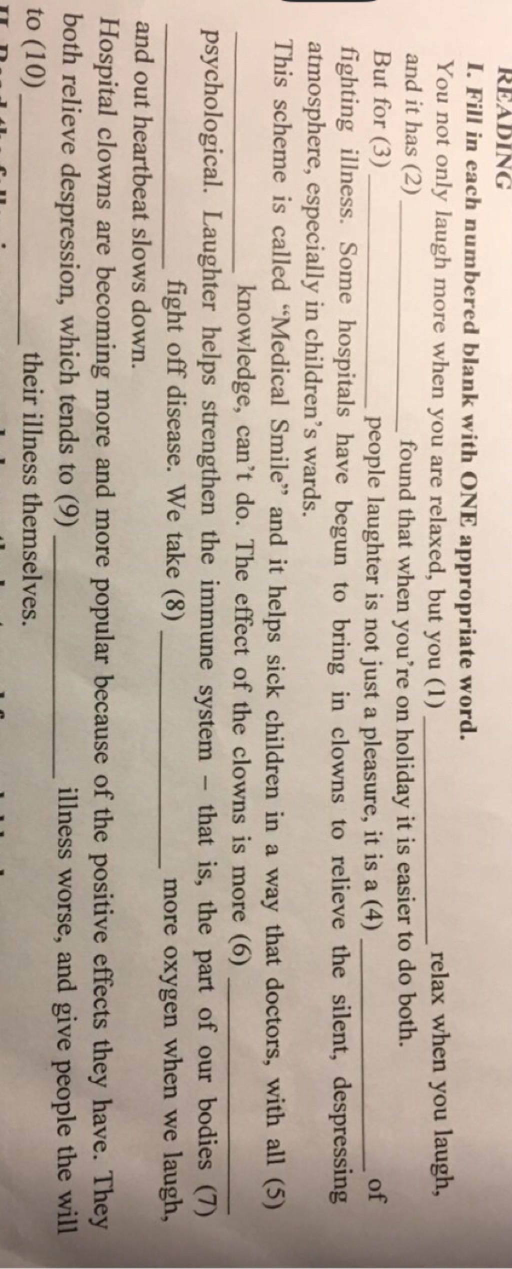 You not only laugh more when you are relaxed, but you (1)___also _____relax when you laugh, and it has been found that when you’re on holiday it is easier to do both. But for (2)___some _____people laughter is not just a pleasure, it is a (3)__way ______of fighting illness. Some hospitals have begun to bring in clowns to relieve the silent, depressing atmosphere, especially in children’s wards. This scheme is (4)__called ______ “Medical Smile” and it helps sick children in a way that doctors, with all their knowledge, can’t do. The effect of the clowns is more than psychological. Laughter helps strengthen the immune (5)___system_____ - that is, the part of our bodies (6)__which ______fights off disease. We take (7)__in______more oxygen when we laugh, (8)__and______our heartbeat slows down . Hospital clowns are becoming more and more popular (9)__because ______of the positive effect they have. They both relieve depression, which tends to (10)_make_______ illnesses worse, and give people the will to fight their illnesses themselves.