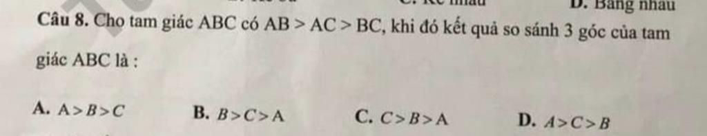 `=>` Chọn đáp án `C.\hat{C}>\hat{B}>\hat{A}`