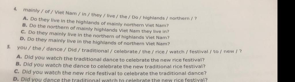 4. mainly / of/ Viet Nam / in / they/live/ the / Do/highlands / northern / ?