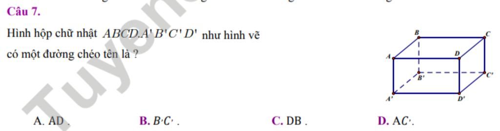 Hình hộp chữ nhật `ABCD.A'B'C'D'` có `4` đường chéo. Đó là: `AC'; BD'; CA'; DB'`
