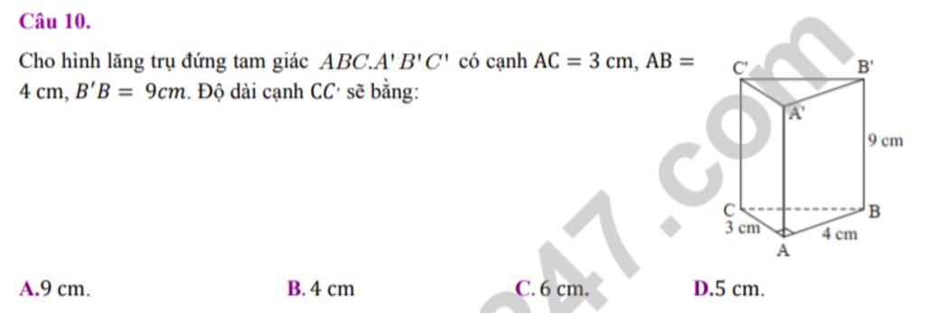 Quan sát hình, ta thấy: `C``C' = A``A' = BB' = 9` `cm`
