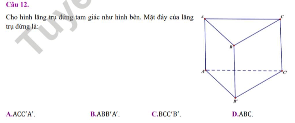 Câu $12.$ Cho hình lăng trụ đứng tam giác như hình bên.