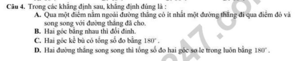 `A.` Loại vì đây là tiên đề Euclid (Ơ-clit): Qua một điểm ở ngoài một đường thẳng, chỉ có duy nhất một đường thẳng song song với đường thẳng đó.