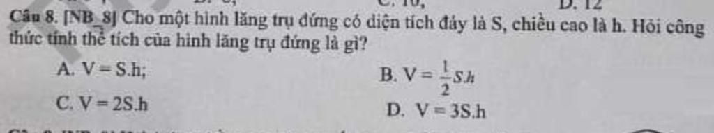 `@` Để tính thể tích của hình lăng trụ ta lấy diện tích đáy nhân với chiều cao