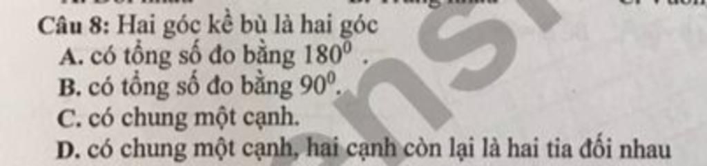 Theo định nghĩa : Hai góc kề bù là hai góc có chung một cạnh, hai cạnh còn lại là hai tia đối nhau