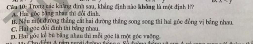 `D.` Hai góc kề bù bằng nhau thì mỗi góc là một góc vuông ( Định lí vì có điều kiện )