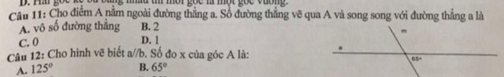 `=>` Qua điểm `A` nằm ngoài đường thẳng `a`, chỉ có duy nhất `1` đường thẳng vẽ qua `A` và song song với đường thằng `a`