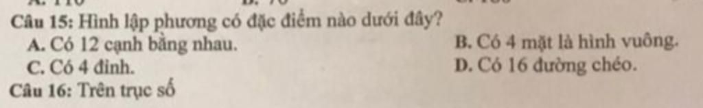 `C` sai vì hình lập phương gồm có `8` đỉnh