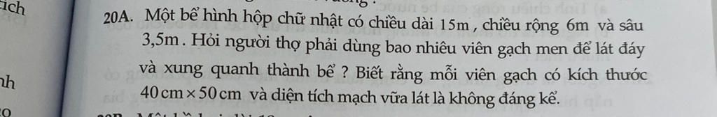 Số viên gạch men người thợ phải dùng để lát đáy và xung quanh thành bể là: