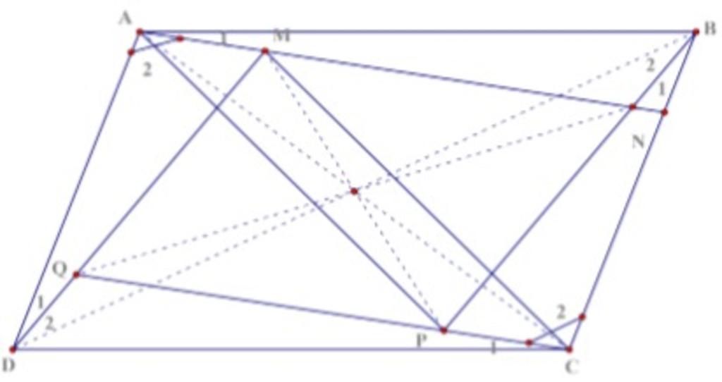 Xét tam giác AQMAQM và CNPCNP có: AQ = CNAM = ˆ A B C CPQAM = ˆ A B C NCP(do ABCD là hình bình hành) AQ=CNAM= ˆ A B C CPQAM= ˆ A B C NCP(do ABCD là hình bình hành) viết lại cho mình chỗ này được không