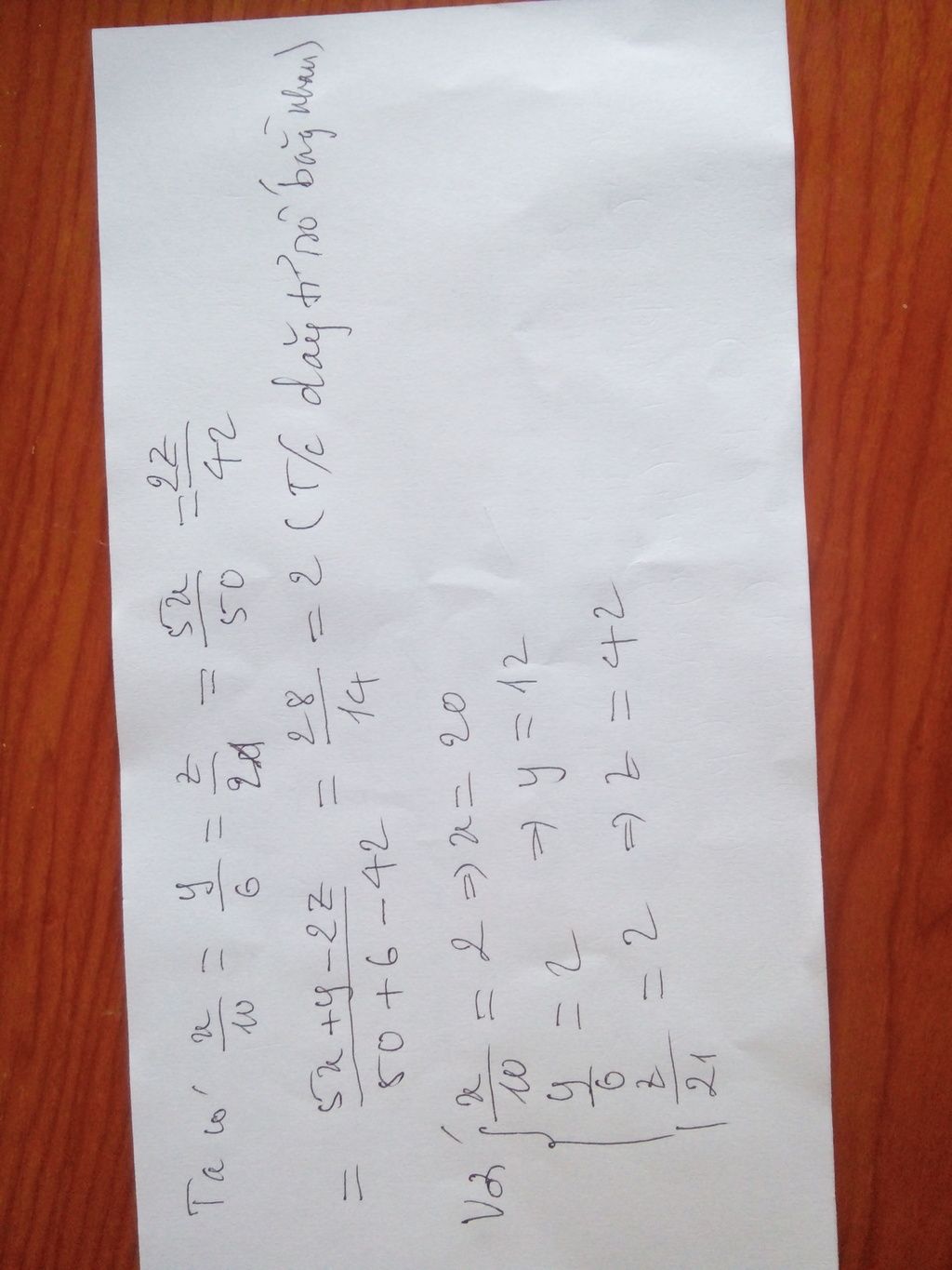 Ta có: x/10 = y/6 = z/21 = 5x/50 = y/6 = 2z/42