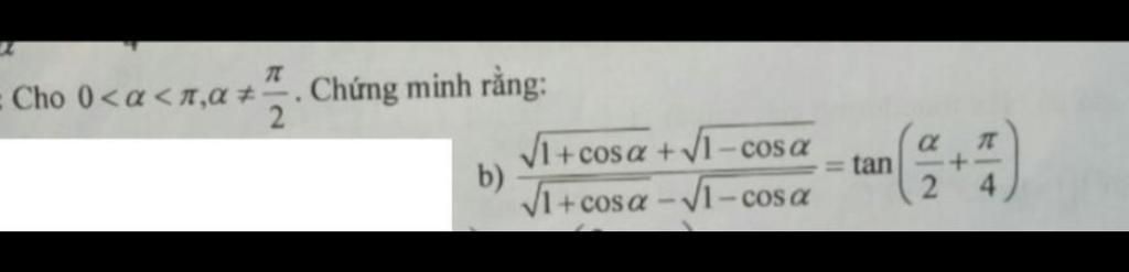 `=>` `(sqrt(1+cosalpha)+sqrt(1-cosalpha))/(sqrt(1+cosalpha)-sqrt(1-cosalpha))=(2sin(alpha/2+pi/4))/(2cos(alpha/2+pi/4))=tan(alpha/2+pi/4)` (đpcm)