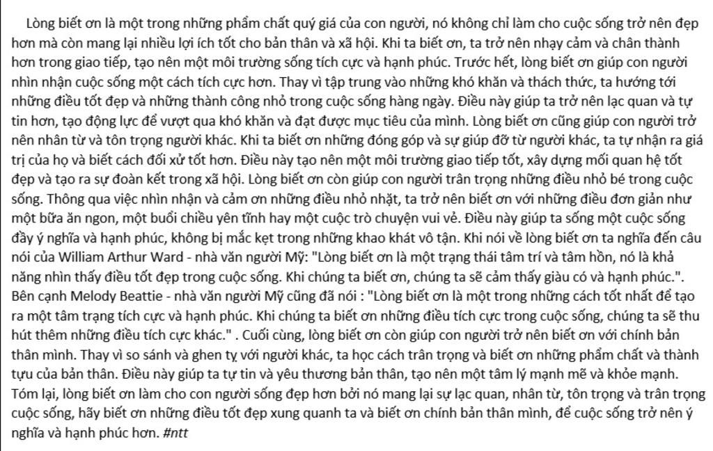 Lòng biết ơn làm con người sống đẹp hơn. Lòng biết ơn là khả năng nhìn thấy những điều tốt lành trong cuộc sống, dù nhỏ nhất hay lớn lao, và trân trọng sự tồn tại của chúng. Khi chúng ta biết ơn, cuộc sống dường như trở nên tươi sáng hơn. Thay vì tập trung vào những khó khăn, thất bại và thách thức, chúng ta tập trung vào những điều tích cực, những thành công nhỏ, những niềm vui nhỏ bé. Điều này giúp chúng ta có cái nhìn tích cực hơn về bản thân và cuộc sống, giúp chúng ta vượt qua những khó khăn một cách mạnh mẽ hơn. Lòng biết ơn cũng giúp ta tạo ra một môi trường xã hội tích cực hơn. Khi chúng ta biết trân trọng những người xung quanh, cảm ơn sự giúp đỡ và hỗ trợ từ họ, chúng ta tạo ra một môi trường tôn trọng và đoàn kết. Lòng biết ơn là khích lệ cho sự tương tác tích cực, khám phá những giá trị và phẩm chất đáng trân trọng của mỗi cá nhân. Không chỉ làm cho cuộc sống tốt hơn, lòng biết ơn còn giúp ta phát triển tâm hồn và tâm trí. Nó đẩy mạnh sự phát triển cá nhân, giúp ta thấu hiểu sâu hơn về bản thân và xác định mục tiêu sống của mình. Biết ơn cũng khơi gợi lòng rộng lượng, sẵn sàng chia sẻ và giúp đỡ người khác, từ đó tạo nên môi trường xã hội tốt đẹp hơn. Tóm lại, lòng biết ơn là một giá trị vô cùng quan trọng trong cuộc sống con người. Hãy nuôi dưỡng lòng biết ơn trong tâm hồn để cuộc sống trở nên đẹp hơn và ý nghĩa hơn.