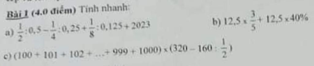 `c)` `(100 + 101 + 102 + ... + 999 + 1000) xx (320 - 160 : 1/2)`