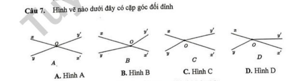 `=>` Hình vẽ có cặp góc đối đỉnh là: Hình `A`