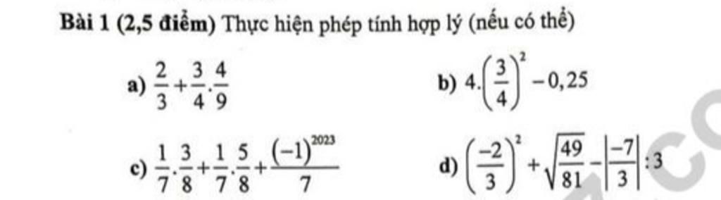 `d)((-2)/3)^2+sqrt{49/81}-|(-7)/3|:3`