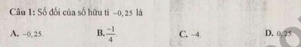 Số đối của số hữu tỉ `-0,25` là: `0,25`