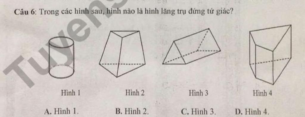 `=>` Hình lăng trụ đứng tứ giác là: Hình `4`