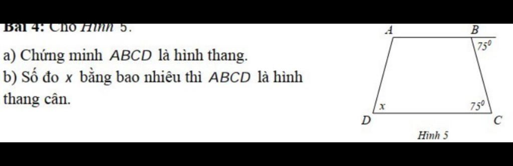 Vậy `x=75^o` thì `ABCD` là hình thang cân.