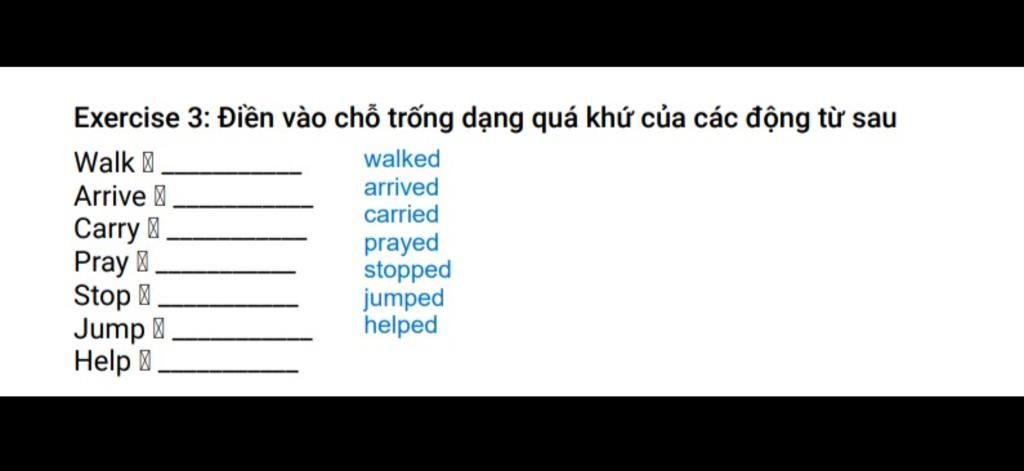 * Thêm ed với động từ kết thúc là “phụ âm + y” chính là đổi “y” thành ‘i” rồi thêm ed: