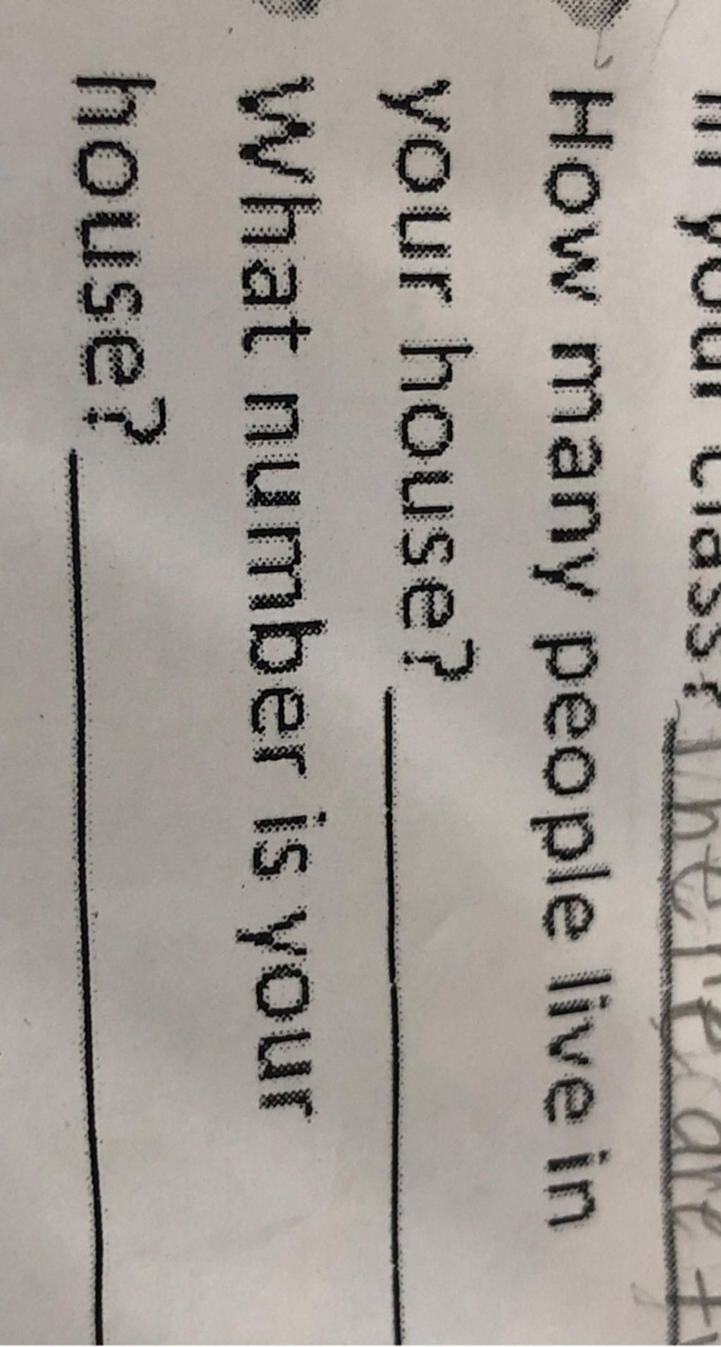 1 . How many people live in your house ? ( Hỏi về số người trong gia đình . Dịch : Có bao nhiêu người sống trong nhà của bạn ? )
