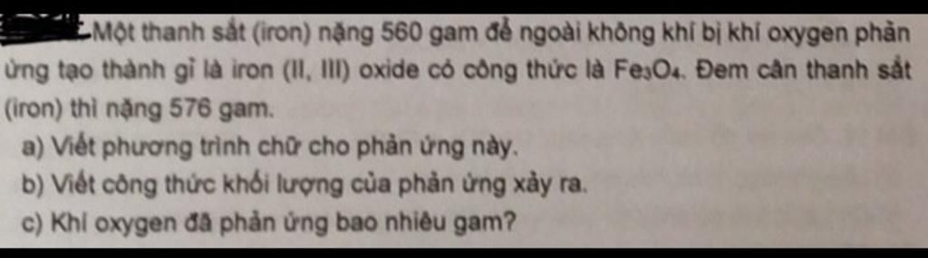 iron + khí oxygen `→` iron (II,III) oxide