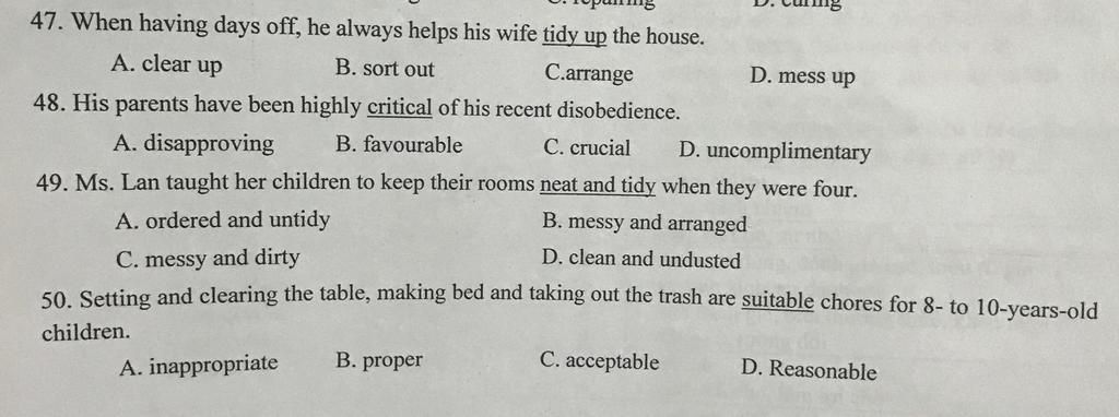 `-` Ta có: Neat and tidy: Gọn gàng và ngăn nắp. >< Messy and dirty: Bừa bộn và bẩn thỉu.