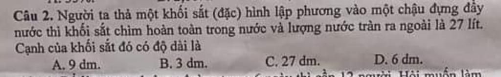 Vậy cnh của khối sắt có độ dài là $3dm$