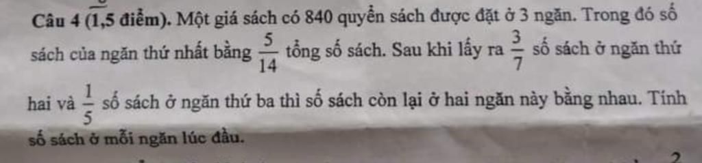 `=>` `4/7` ngăn thứ nhất `=` `4/5` ngăn thứ hai `=` `3/5` ngăn thứ ba