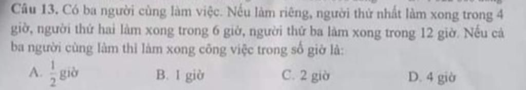 Nếu cả ba người cùng làm thì làm xong công việc trong số giờ là: