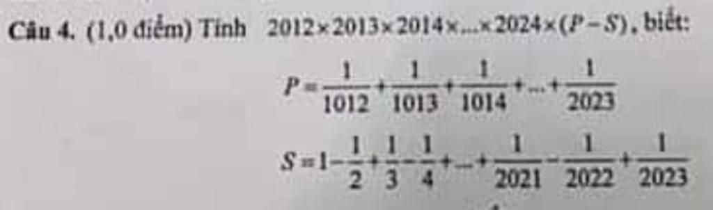 : ... + 1 2023 − ( 1 1012 + 1 1013 + 1 1014 + ... + 1 2023 ) ] = 2012 × 2013 × 2014 × ... × 2024 × 0 = 0 ( Số nào nhân với 0 cũng bằng 0 ) Vậy 2012 × 2013 × 2014 × ... × 2024 × ( P − S ) = 0