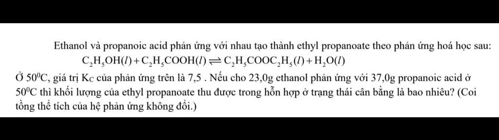 Tại trạng thái cân bằng: $\begin{cases}\rm C_{C_2H_5OH}=0,5-a\ (M)\\\rm C_{C_2H_5COOH}=0,5-a\ (M)\\\rm C_{C_2H_5COOC_2H_5}=a\ (M)\\\rm C_{H_2O}=a\ (M)\end{cases}$