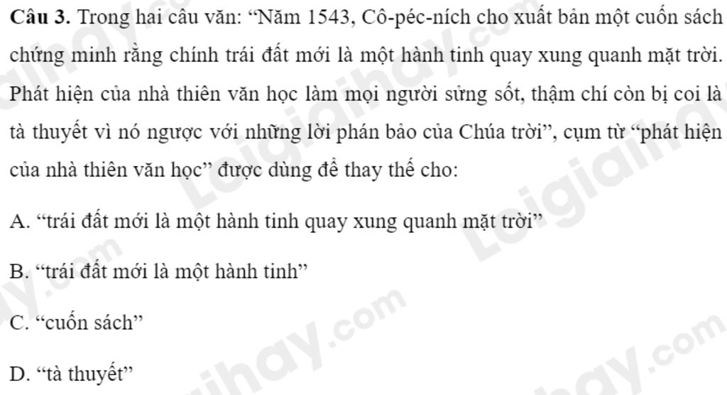 `->`$\text{Chọn A: “trái đất mới là một hành tinh quay xung quanh mặt trời”}$$\\$`->` Cụm từ “phát hiện của nhà thiên văn học” được dùng để thay thế cho$\\$phát hiện của Cô-péc-ních rằng trái đất mới là một hành tinh quay xung $\\$ quanh mặt trời. Đây là một phát hiện quan trọng trong lịch sử khoa học $\\$ và đã thay đổi cách nhìn của con người về vũ trụ.