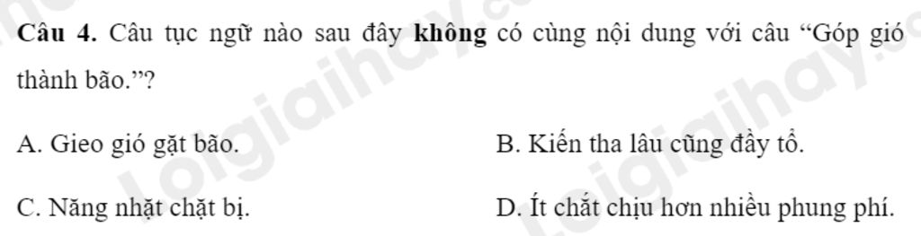 `@` Câu tục ngữ không có cùng nội dung với câu ''Góp gió thành bão'' là: